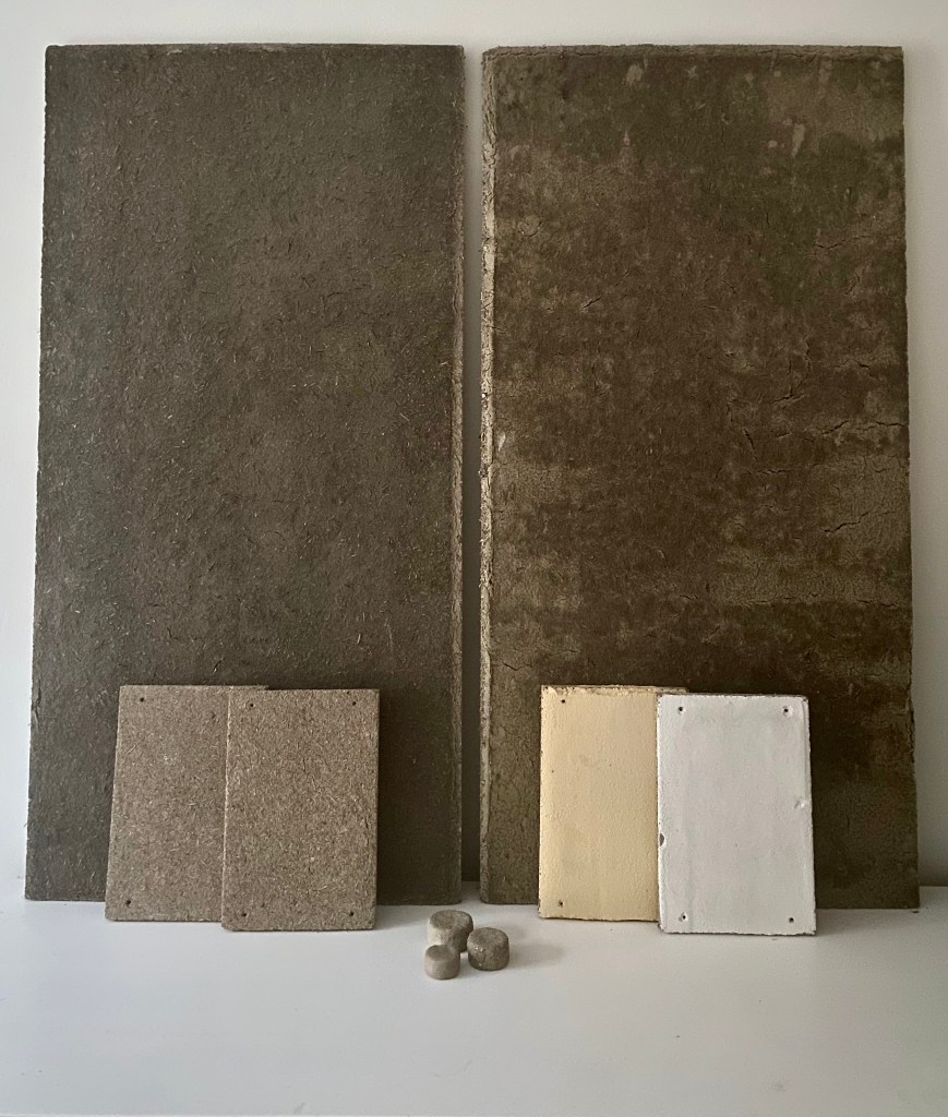 Lerpanel / byggeplade: 1200x600x22 mm, vægt 14 kg. Består af af ubrændt ler, plantefiber og biobaseret binder. Det er designet til at være stærkt og let håndterbart, og kan holde 35 kg i en skrue. Det tilskæres let med sav og monteres med skruer eller søm.